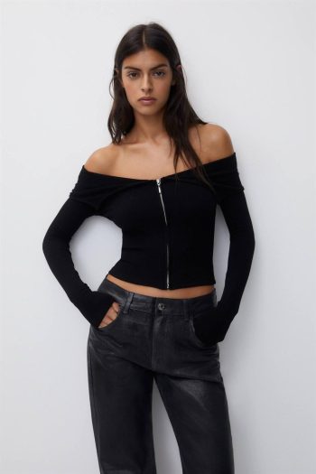 Off-The-Shoulder Zip-Up T-Shirt Black | Women Long Sleeve