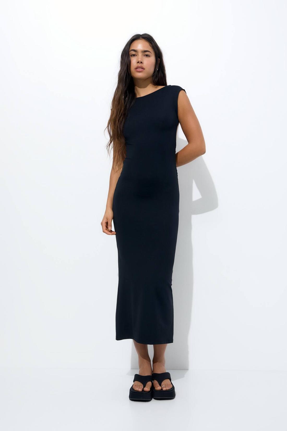 Long Fitted Polyamide Dress With An Open Back, A Crew Neck, Short Sleeves And Gathered Detail. Composición