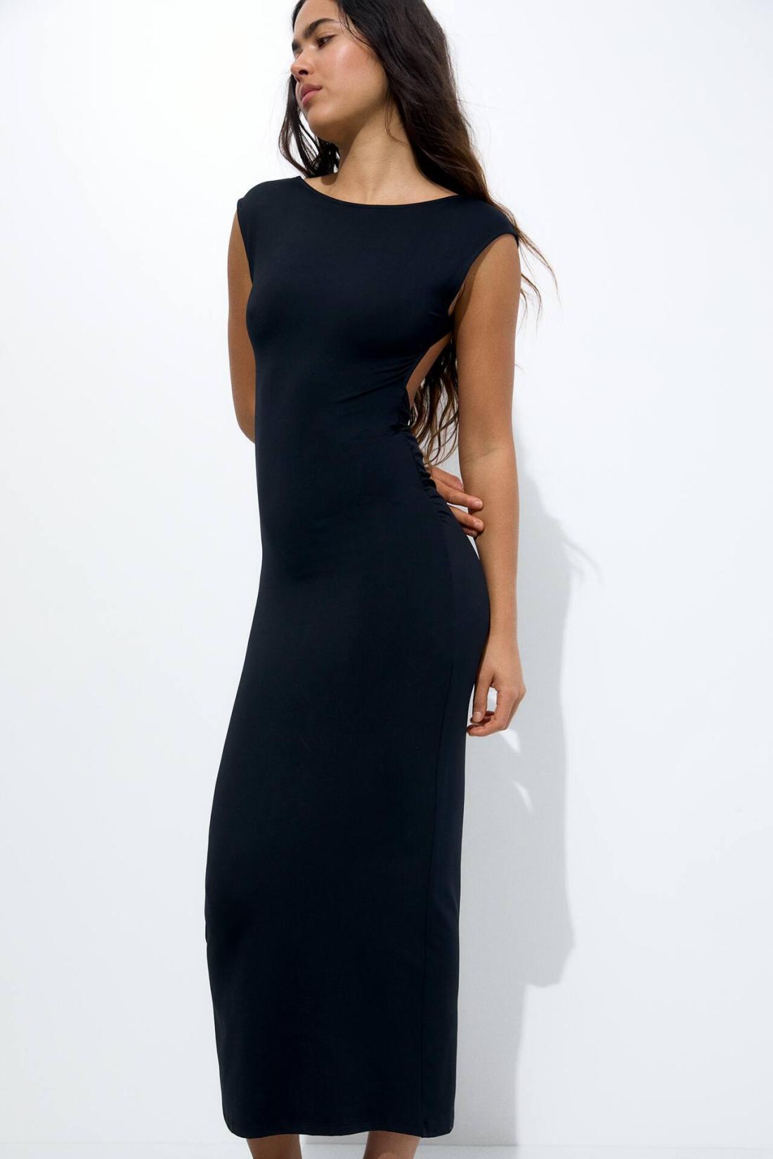 Long Fitted Polyamide Dress With An Open Back, A Crew Neck, Short Sleeves And Gathered Detail.