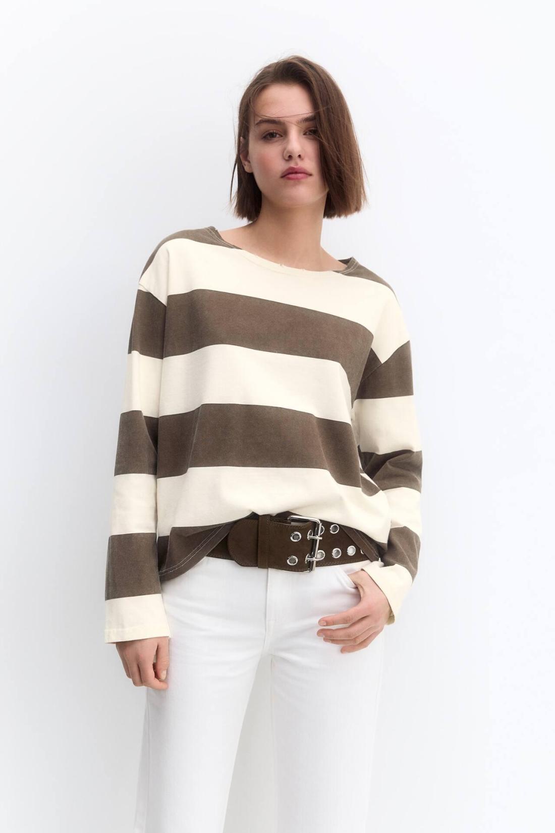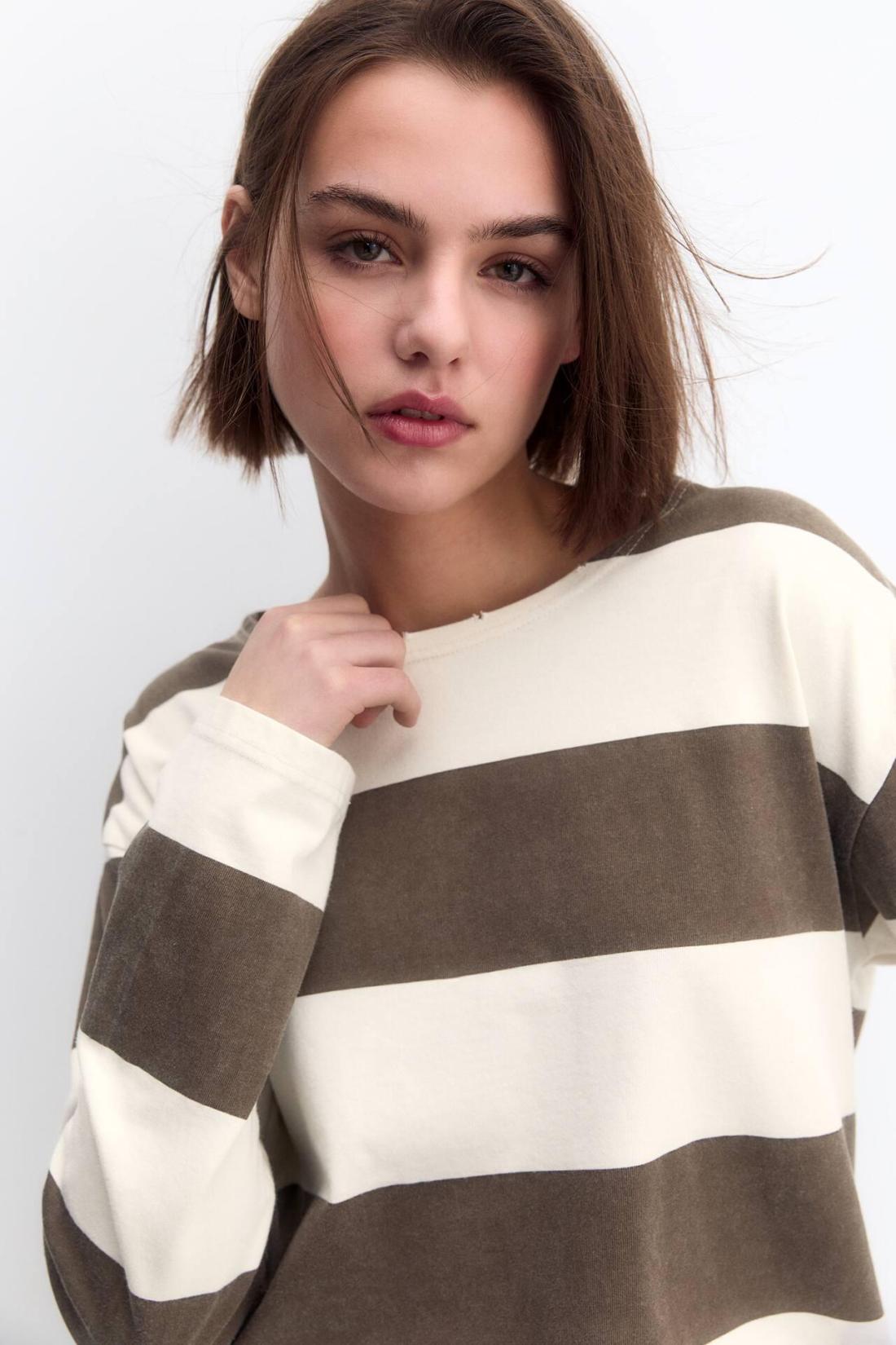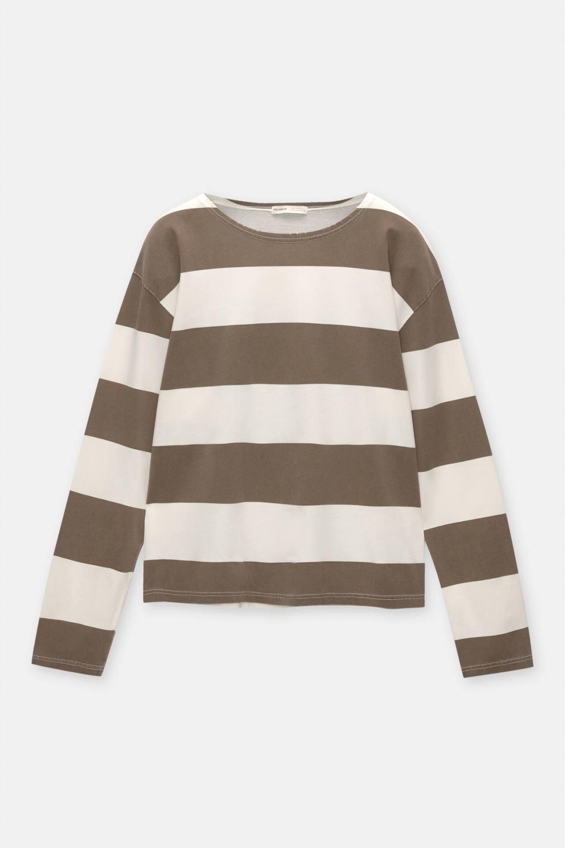 Long Sleeve T-Shirt With A Round Collar And Striped Print. Made Of Cotton. Composición